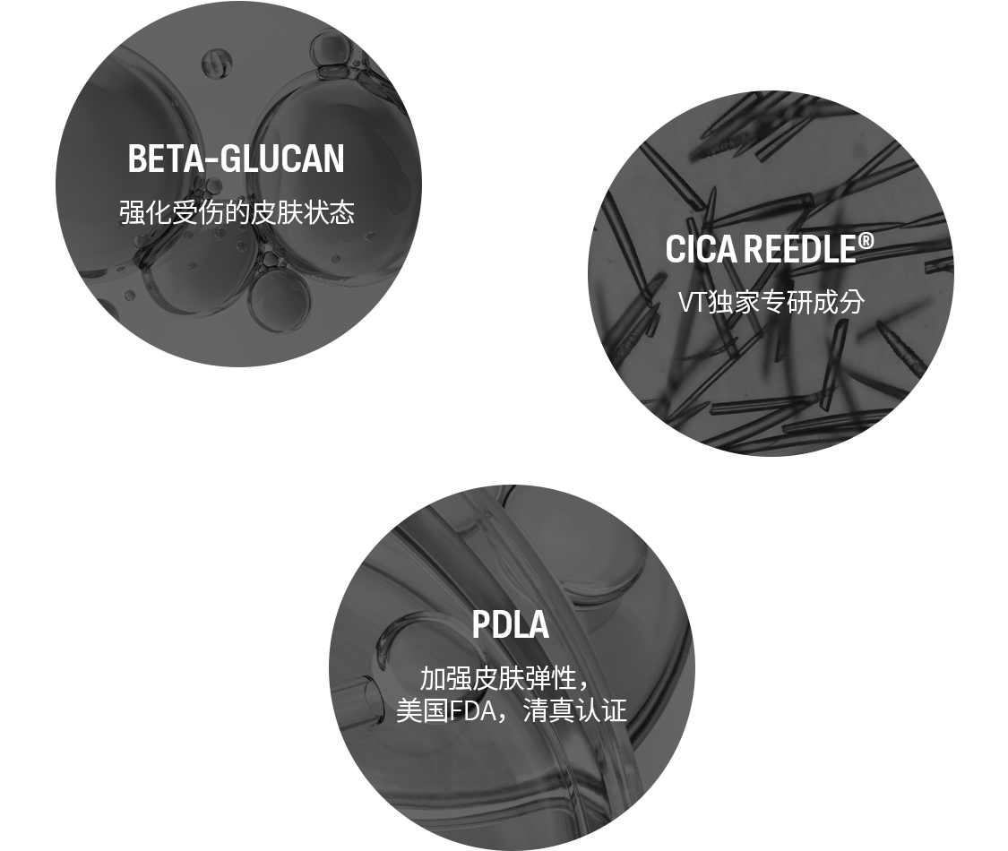 比毛孔小14倍的微型VT独家专研成分CICA REEDLE®,直达毛孔促进焕新再生以及有效成分的吸收并,细致刺激皮肤,唤醒肌肤恢复自然健康状态的