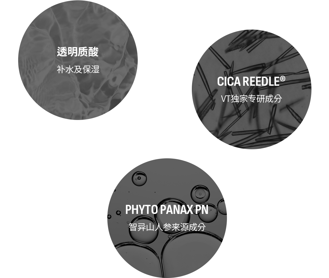 比毛孔小14倍的微型VT独家专研成分CICA REEDLE®,直达毛孔促进焕新再生以及有效成分的吸收并,细致刺激皮肤,唤醒肌肤恢复自然健康状态的