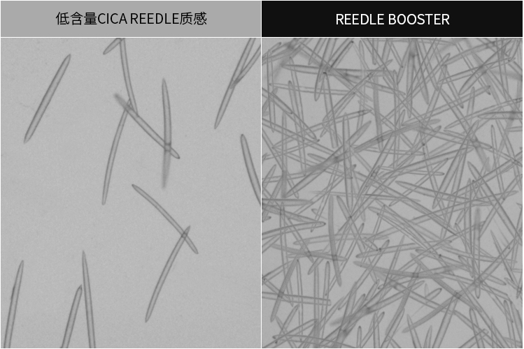 交叉连接结构形成网状物配方坚固氢键,皮肤上涂抹时网状物会自然松开而轻柔贴紧肌肤,使高含量CICA REEDLE®稳定传递皮肤的顶级动能素——REEDLE BOOSTER